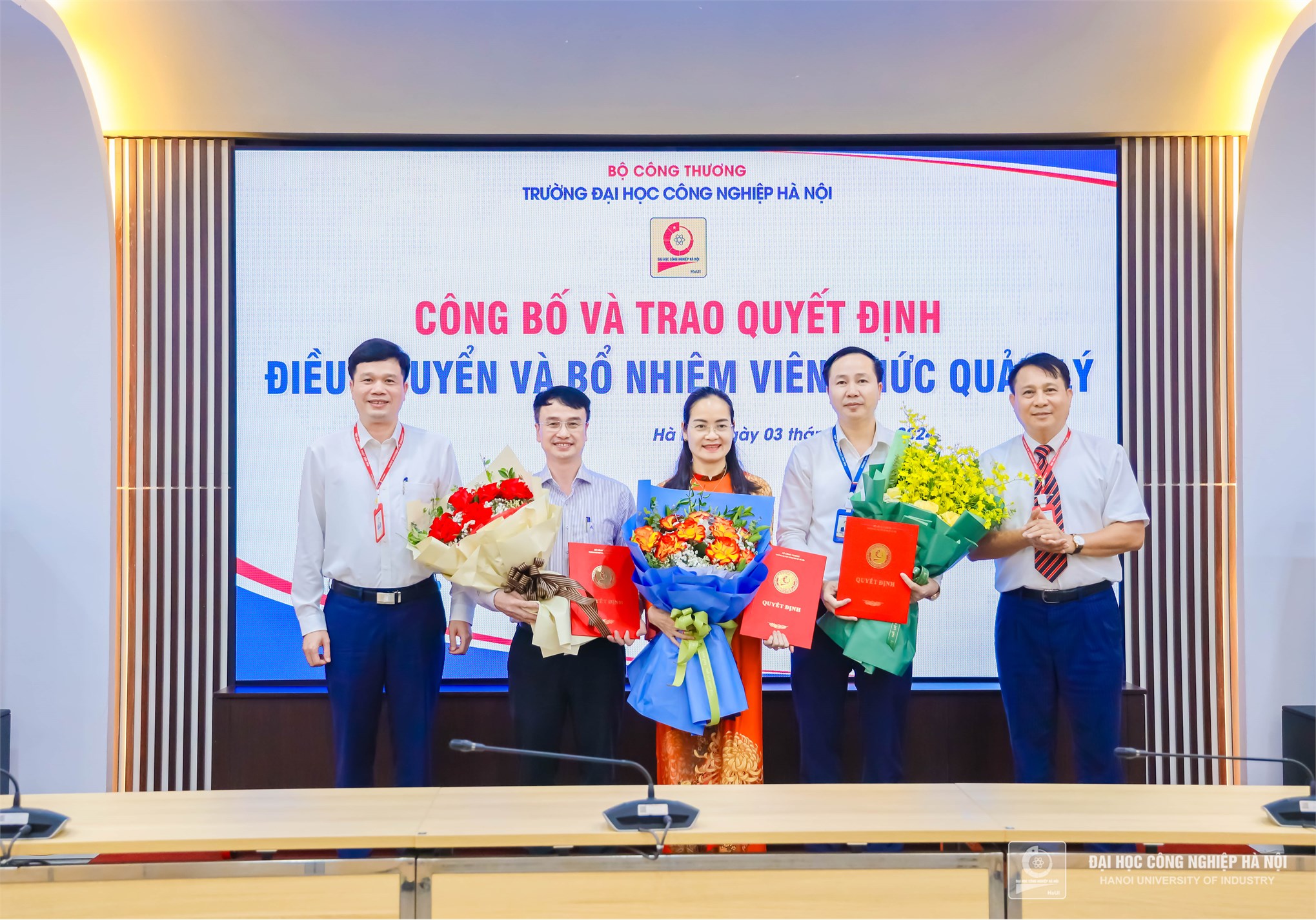 3 viên chức quản lý được điều chuyển và bổ nhiệm: ông Phan Đăng Hưng giữ chức vụ Trưởng phòng Tổ chức Hành chính, Trường Đại học Công nghiệp Hà Nội; bà Nguyễn Thị Hồng Nga giữ chức vụ Hiệu trưởng Trường Kinh tế, Trường Đại học Công nghiệp Hà Nội; ông Vũ Đình Khoa giữ chức vụ Phó Hiệu trưởng Trường Kinh tế, Trường Đại học Công nghiệp Hà Nội