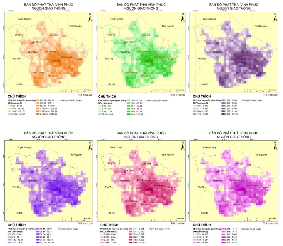 Bản đồ tổng hợp phát thải CO, VOC, NOx, TSP, PM 2.5, SO2 từ hoạt động giao thông tại tỉnh Vĩnh Phúc (Ảnh: Nhóm nghiên cứu)