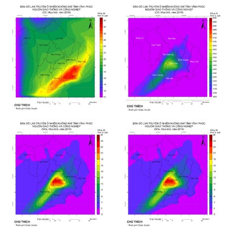 Dựa trên bản đồ phát thải khí thải cho nguồn giao thông và công nghiệp, nhóm nghiên cứu tiếp tục xây dựng 04 bản đồ lan truyền ô nhiễm tỷ lệ 1/50.000 cho các chất ô nhiễm CO, O3, SO2, NOx.