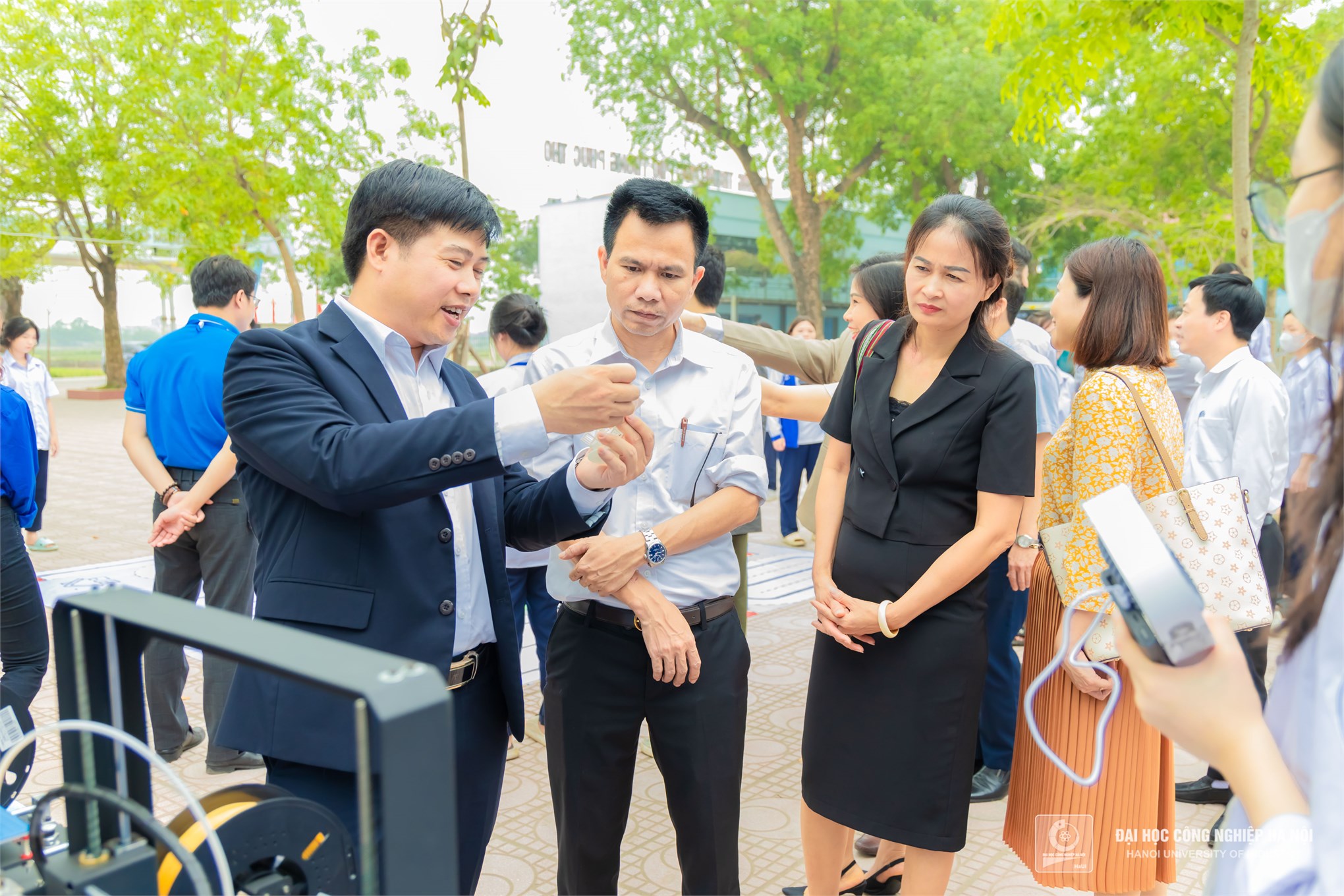 Thầy Hoàng Tiến Dũng – Hiệu trưởng Trường Cơ khí – Ô tô, Đại học Công nghiệp Hà Nội, thầy Nguyễn Thanh Hải - Phó Trưởng phòng Giáo dục và Đào tạo huyện Phúc Thọ tham quan gian hàng sản phẩm sáng tạo STEM