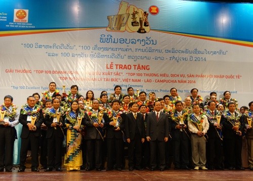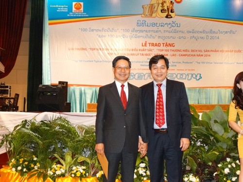TS.Trần Đức Quý và ông Namvi Yaked - Bộ trưởng Bộ Công thương Lào tại lễ trao tặng giải thưởng Top 100 Nhà quản lý tài đức Lào - Việt Nam - Campuchia