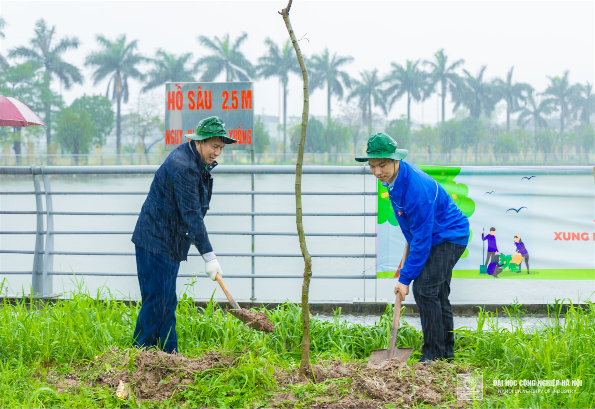 PGS.TS.Lê Hồng Quân – Bí thư Đảng ủy, Chủ tịch Hội đồng Trường và TS.Nguyễn Văn Thiện – Phó Hiệu trưởng Đại học Công nghiệp Hà Nội trồng cây tại công trình “Hàng cây tuổi trẻ”