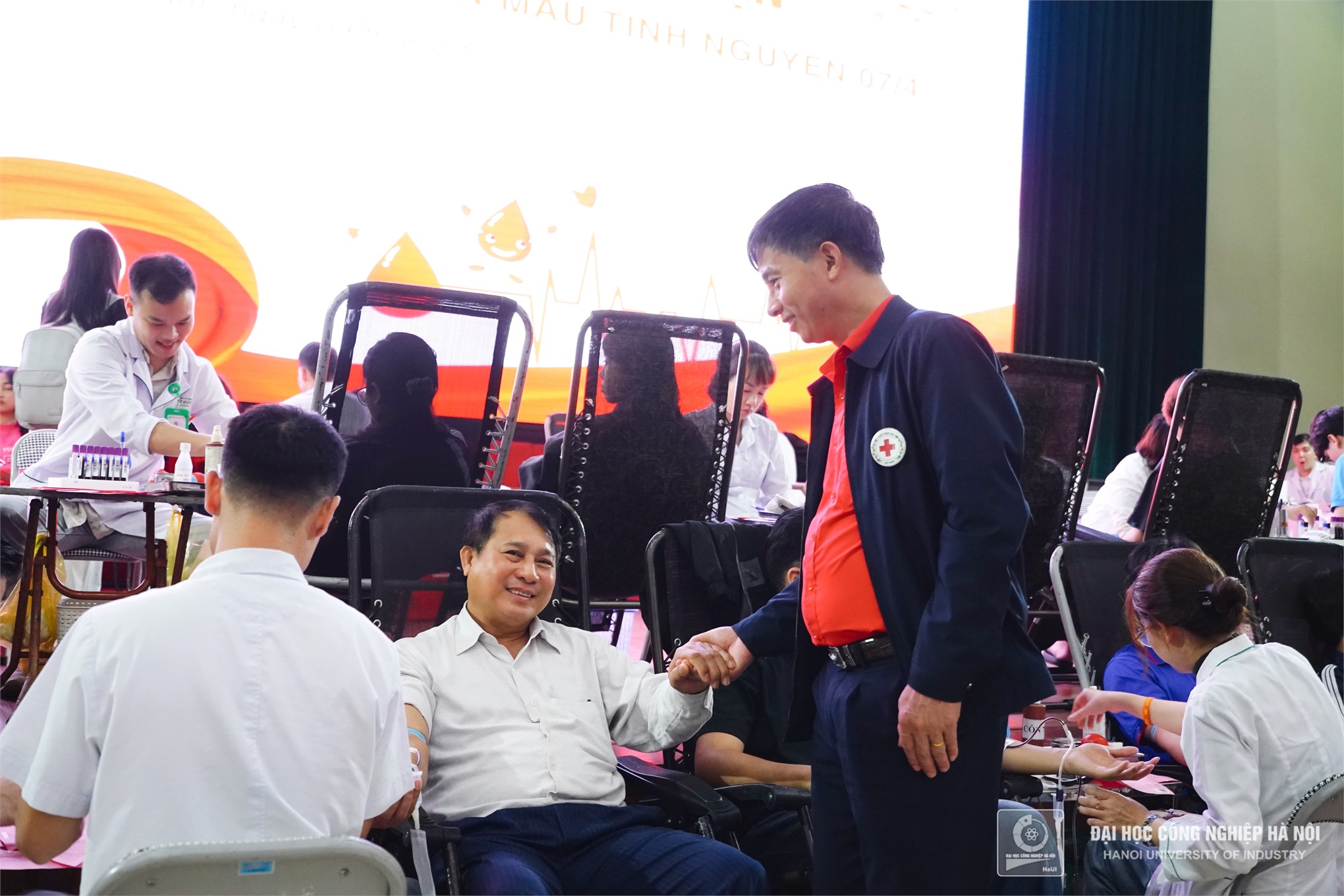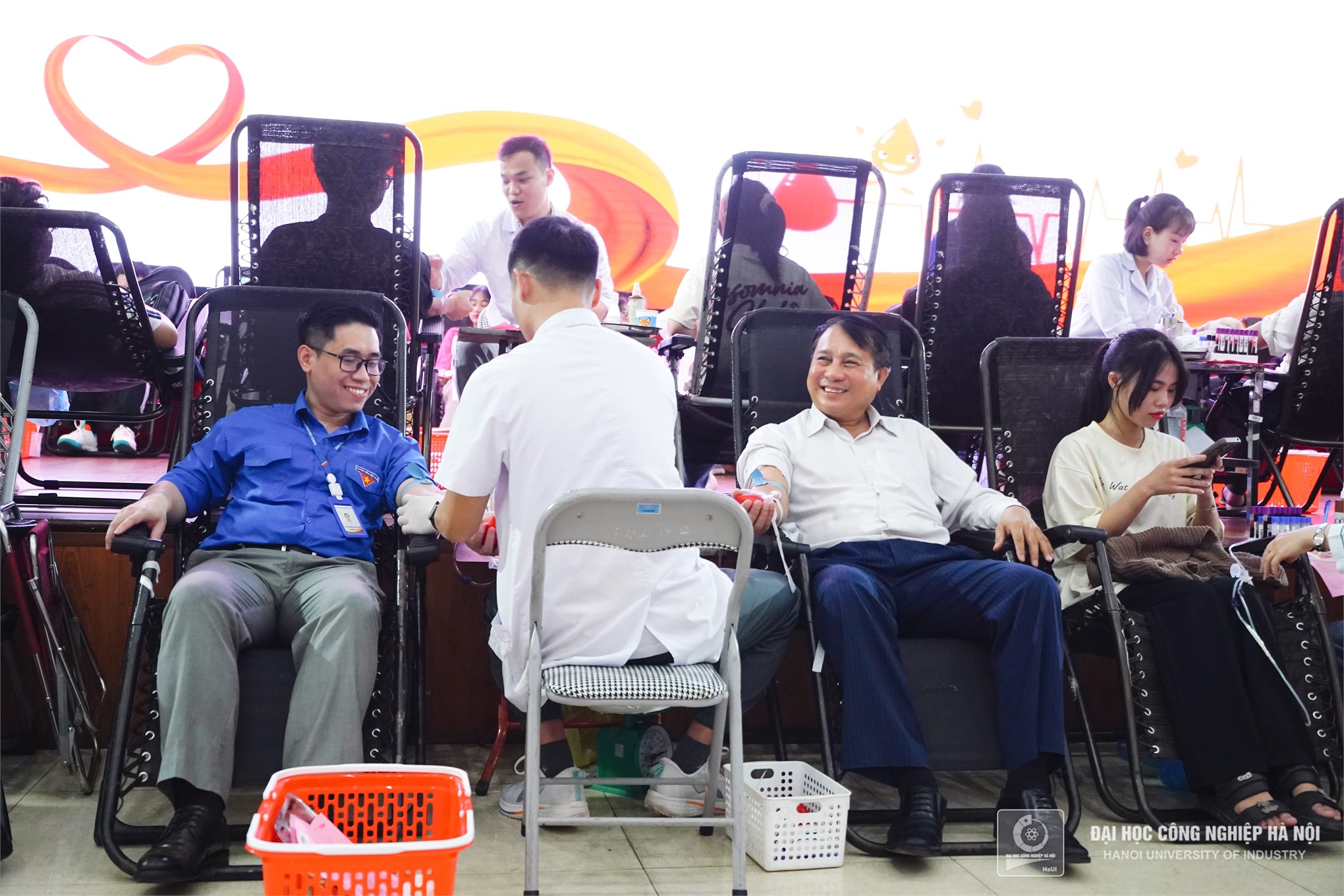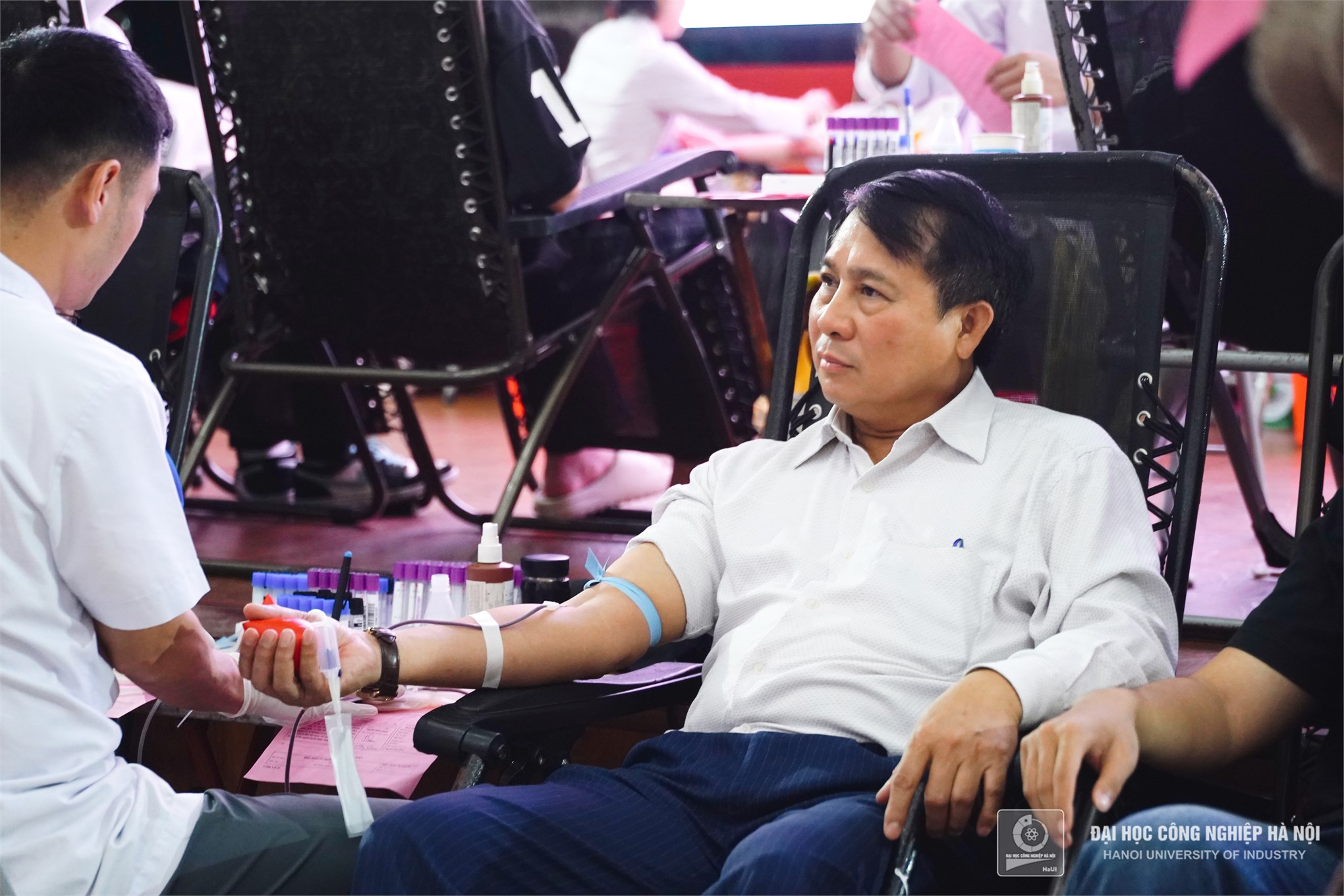 PGS.TS. Lê Hồng Quân - Bí thư Đảng uỷ, Chủ tịch Hội đồng trường tham gia hiến máu tại Ngày hội hiến máu tình nguyện – Cầu vồng nhân ái 2025 tại cơ sở đào tạo Hà Nam, Trường Đại học Công nghiệp Hà Nội ngày 08/04/2025.