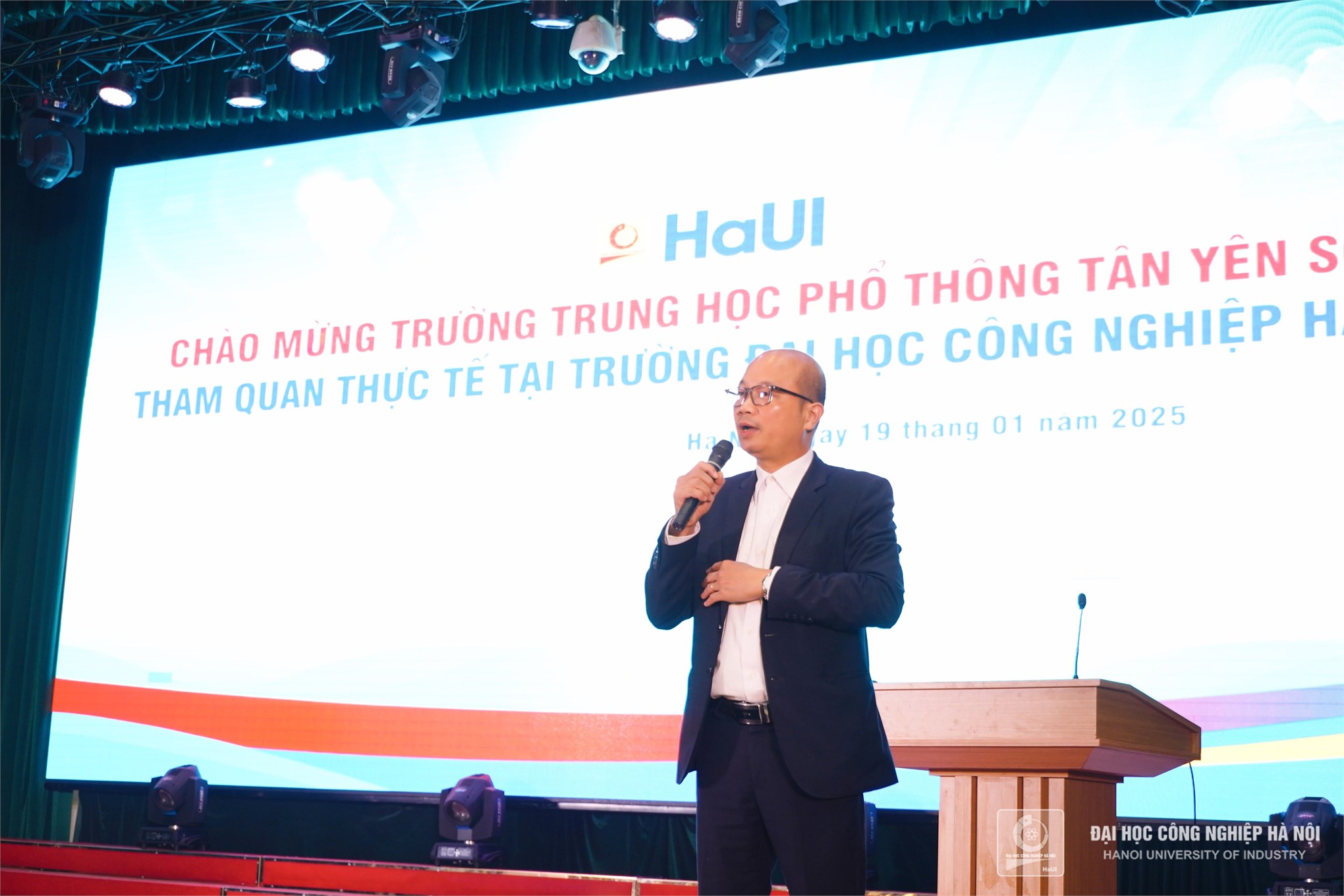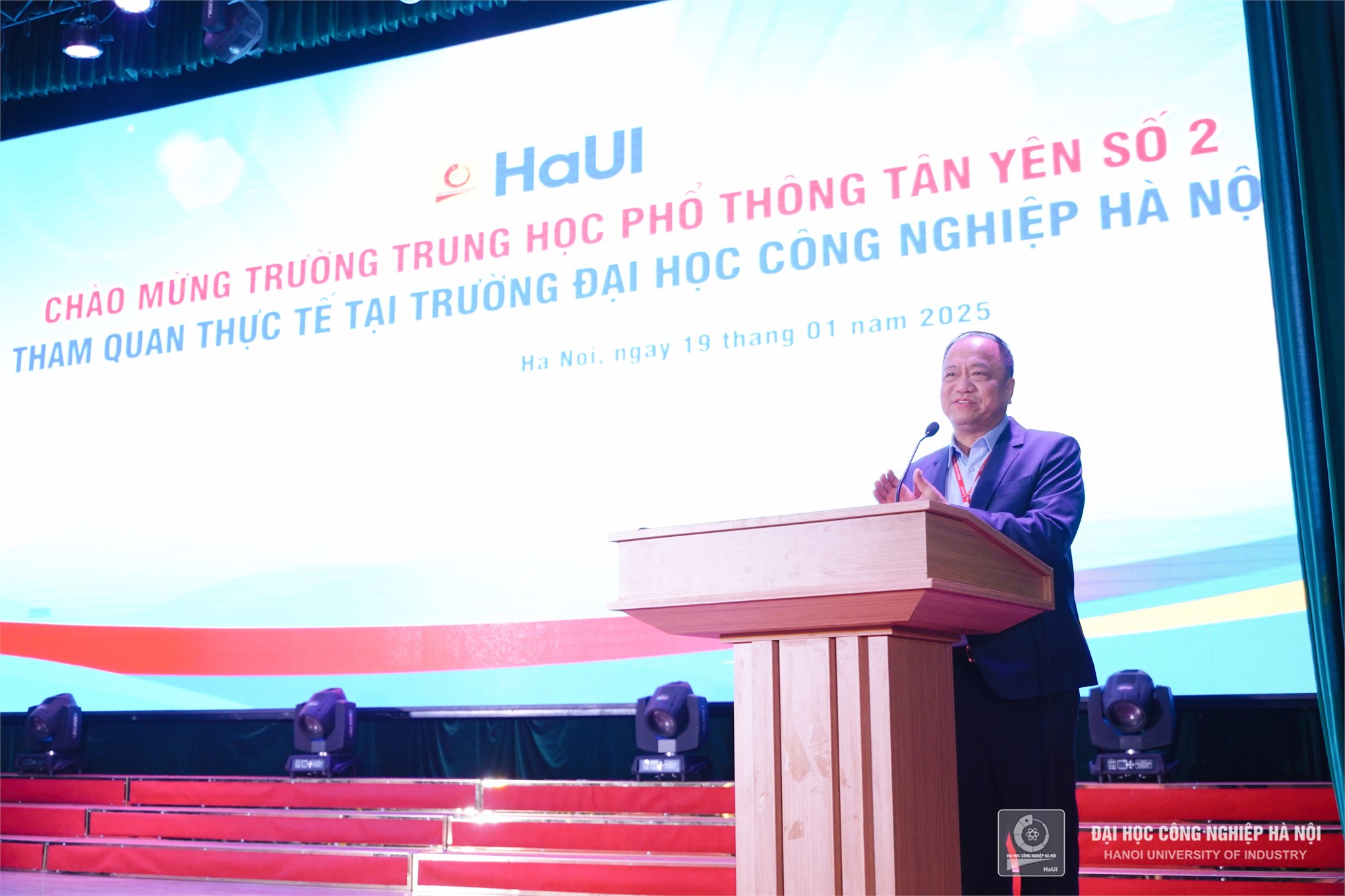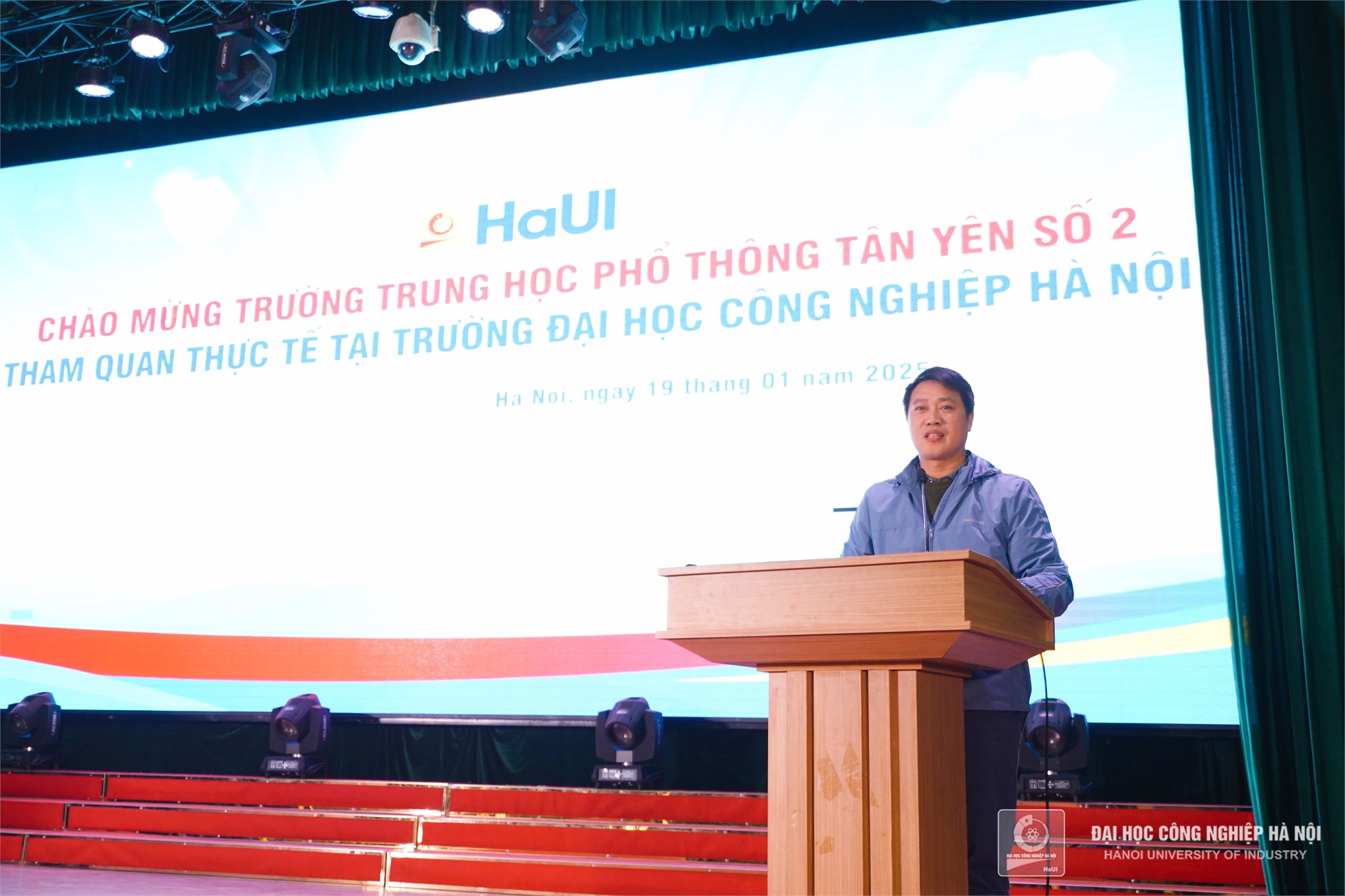 NGƯT.TS. Nguyễn Văn Thiện - Phó Bí thư Thường trực Đảng uỷ, Phó Hiệu trưởng Trường Đại học Công nghiệp Hà Nội phát biểu chào mừng đoàn giáo viên, phụ huynh và hơn 800 học sinh Trường THPT Tân Yên số 2 tham quan HaUI