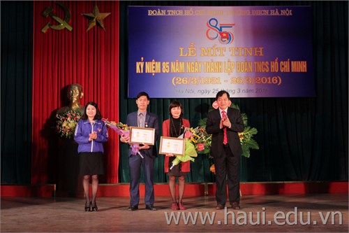 Đồng chí Chu Hồng Minh - UVTV, Trưởng ban TNTN Thành đoàn và PGS.TS. Trần Đức Quý - Bí thư Đảng uỷ, Hiệu trưởng Nhà trường trao tặng kỷ niệm chương cho 02 cá nhân.
